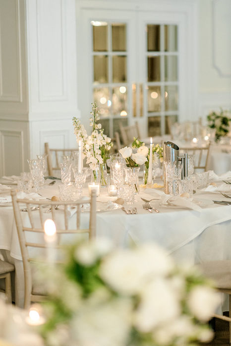 For their reception, I created bespoke wedding menus on luxurious linen card, each thoughtfully personalised with guests' names. These menus were elegantly tied with silky white ribbon, adding a touch of softness and romance to the tablescape. Every detail was designed to reflect Cara and Sean's vision of timeless elegance, making their day as unique as their love story.
